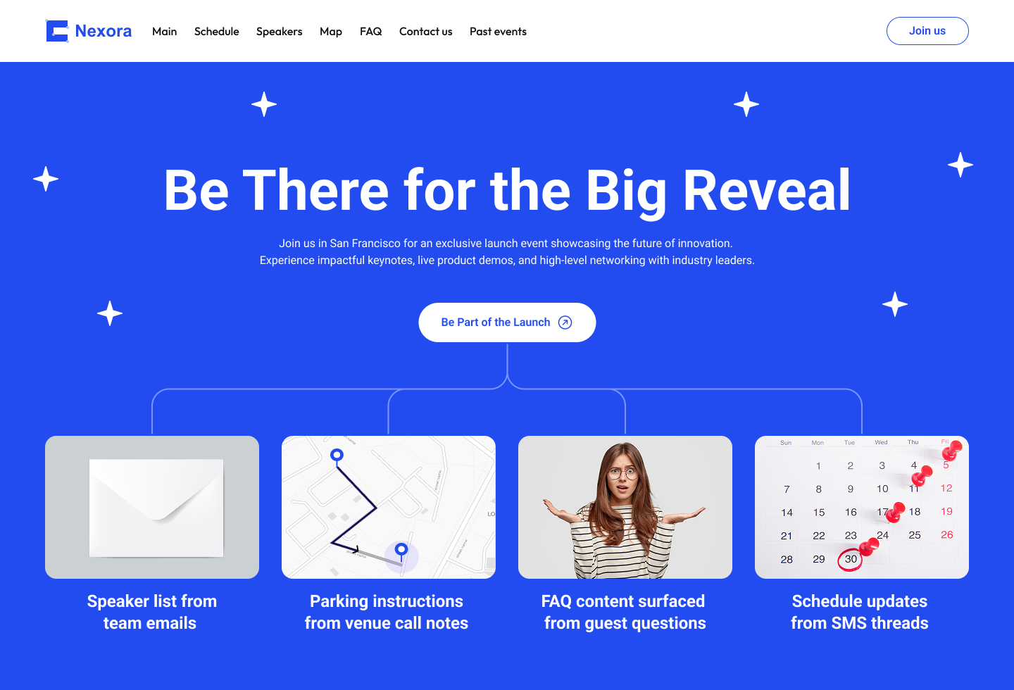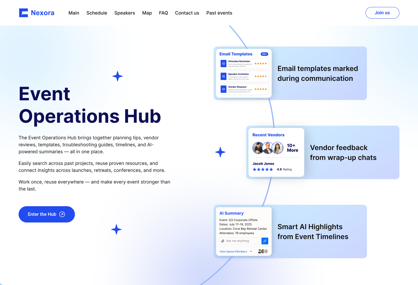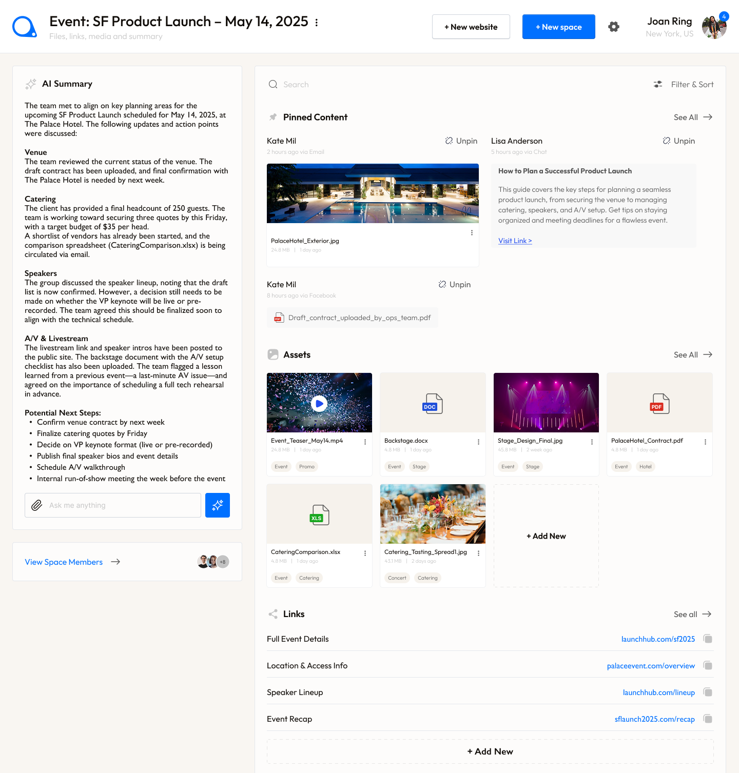 Key info and assets are shared across emails, chats, and social media, and then forgotten once the event ends.