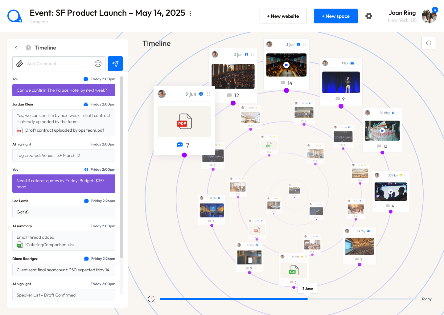 Promote the event with a branded website, track logistics in a shared dashboard, and keep stakeholders aligned with AI-powered summaries. Nothing gets lost and no one is left out.